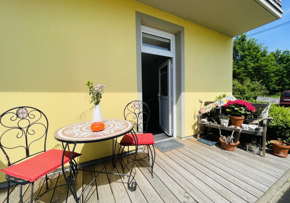 Apartment 1+2 haben eine kleine Terrasse vor dem Zimmer. Sie haben hier ganz phantastische Morgensonne, perfekt zum Frühstücken. Sie benötigen mehr Platz? Dann nutzen Sie bitte den ruhigen und sonnigen Garten (ein einfacher Grill ist vorhanden).
