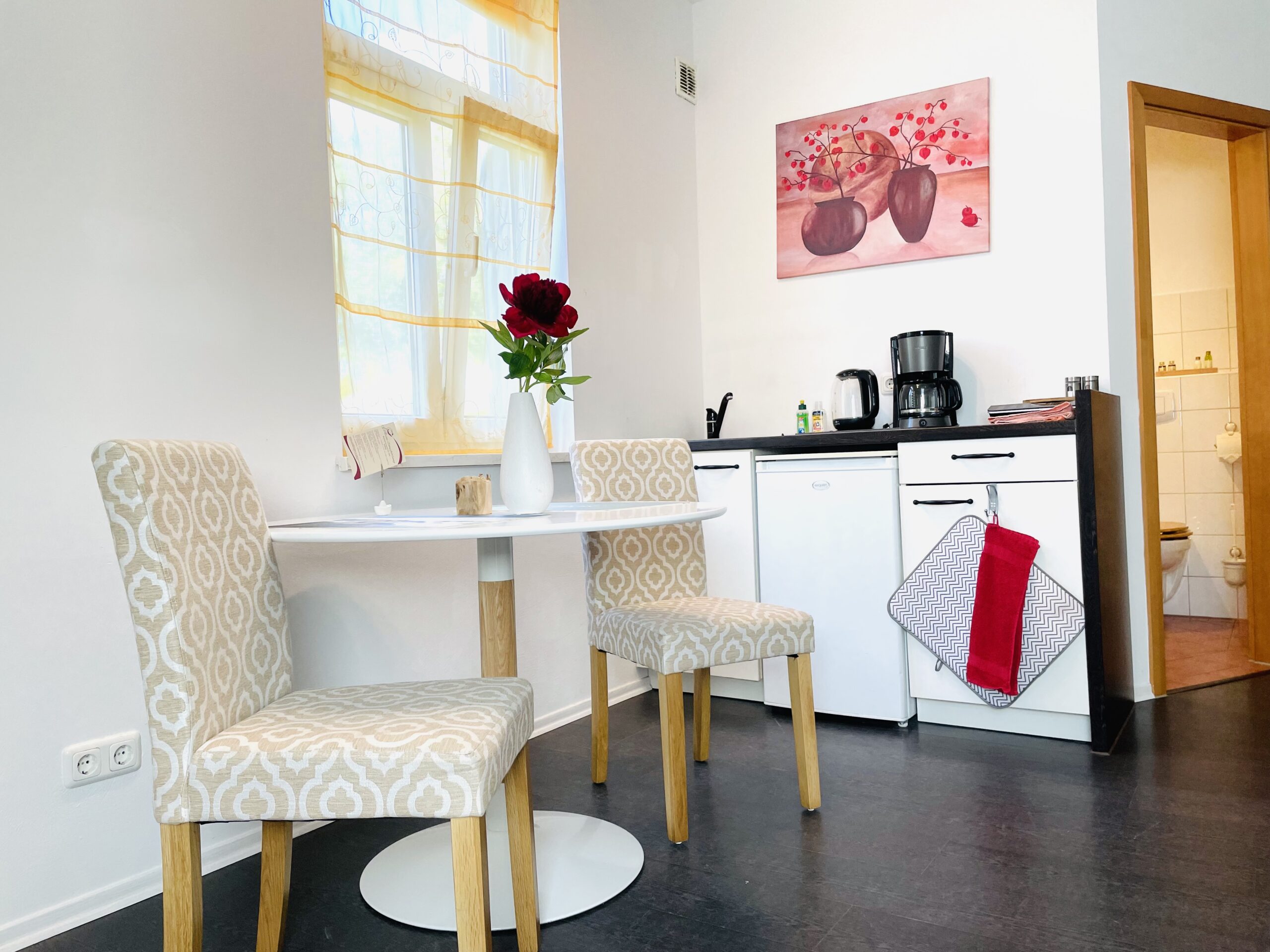 Im Zimmer befindet sich eine Pantry-Küche (Kühlschrank, 1 Induktionskochplatte, ausreichend Geschirr, Töpfe, Besteck, Gläser usw.), Kaffeemaschine, Toaster.