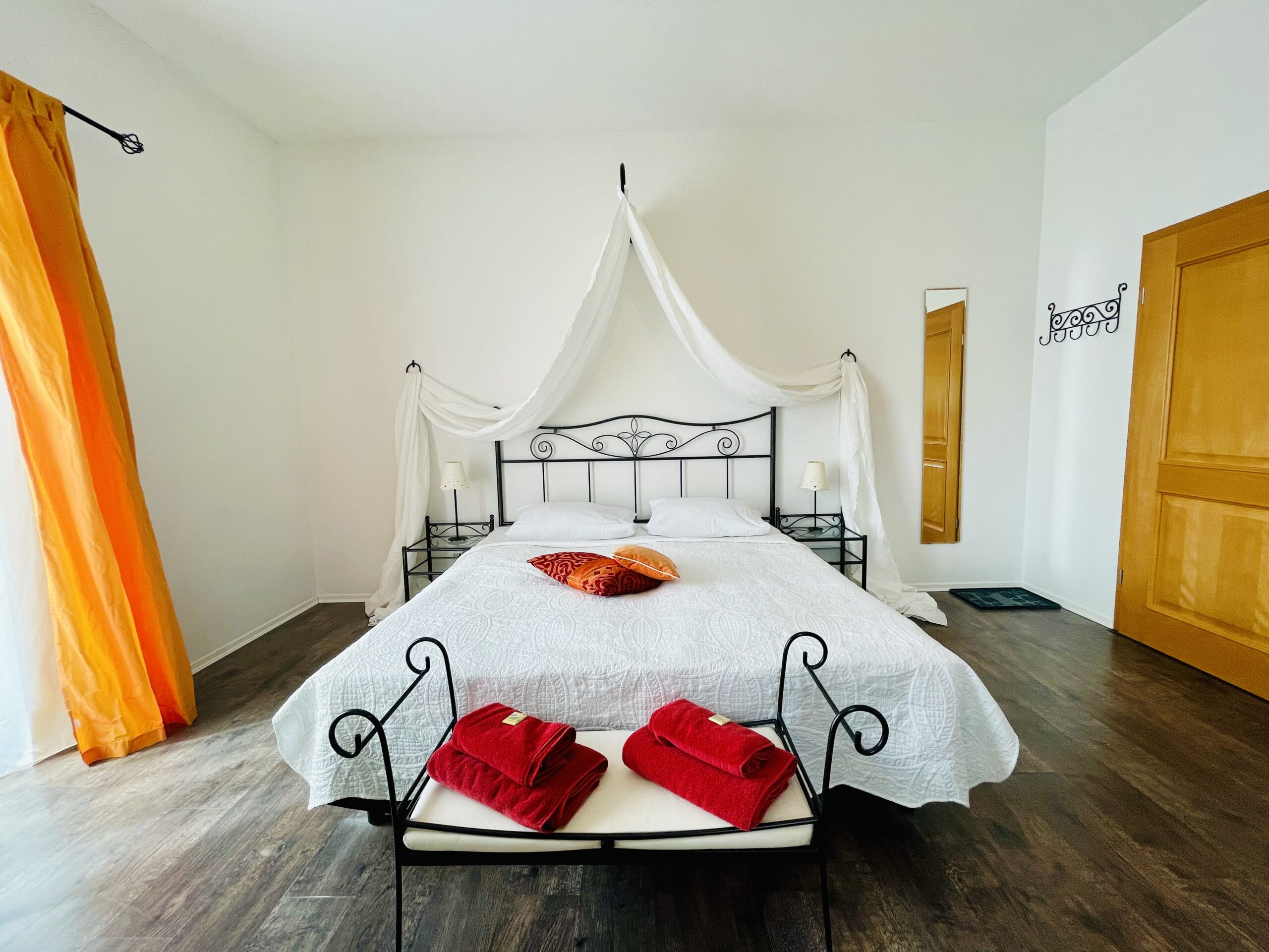 Blickfang ist das Doppelbett mit dem wunderschönen Baldachin, der dem Zimmer ein romantisches Flair einhaucht. Wenn Sie es wünschen, sind die Betten mit strahlend weißer Bettwäsche bezogen. Jeder Gast erhält 2 Handtücher. Strandhandtücher bringen Sie bitte mit.