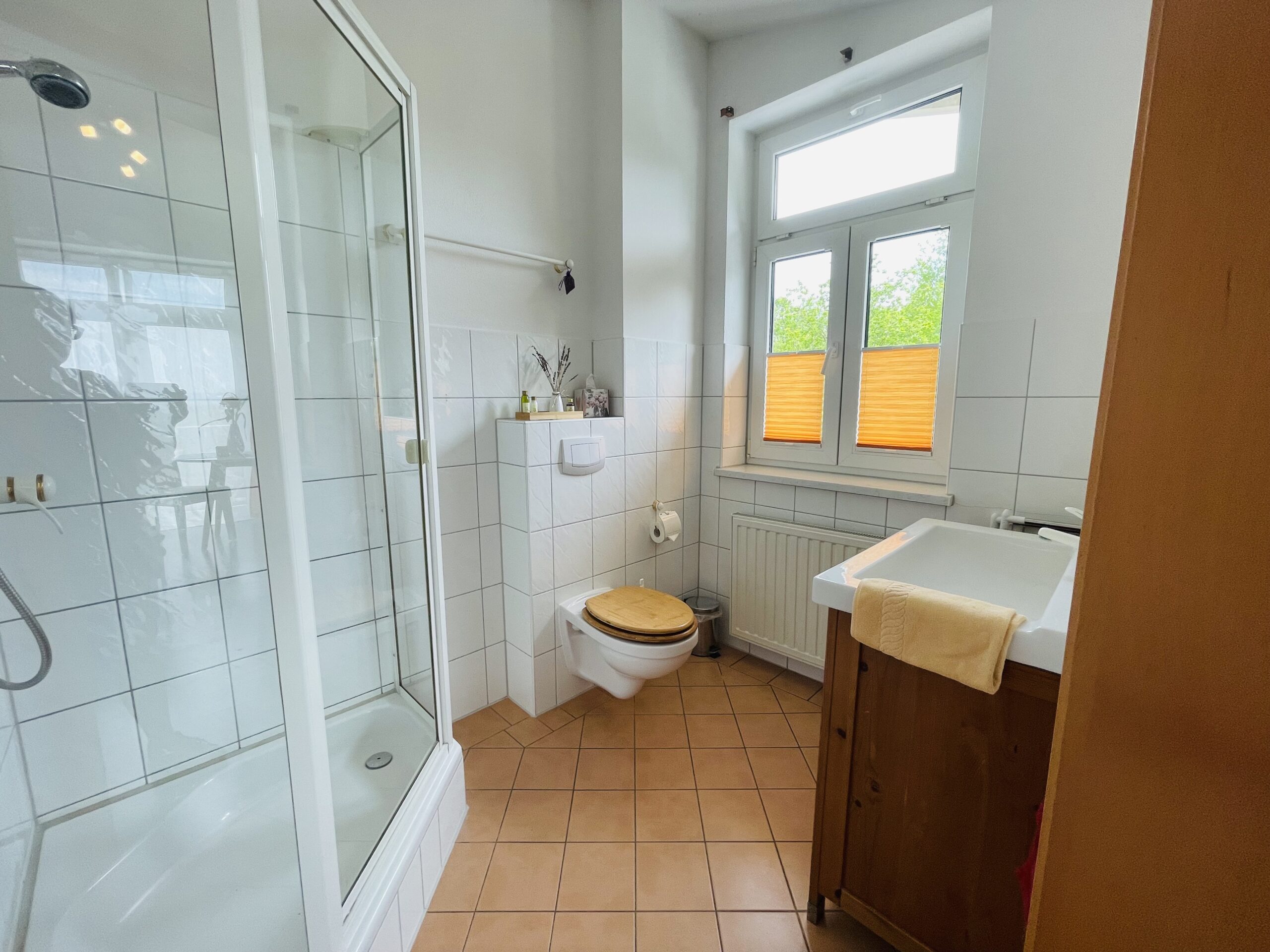 Das Bad ist ebenfalls hell durch ein großes Fenster.